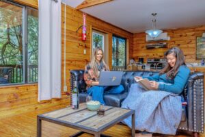 The Trailside Cabins offer another inviting option for working and relaxing. Each includes full kitchens, provided linens, and spacious private decks ideal for enjoying the crisp mountain air. With space for 5-20 guests depending on the unit, they’re a great choice for groups of friends working remotely together.